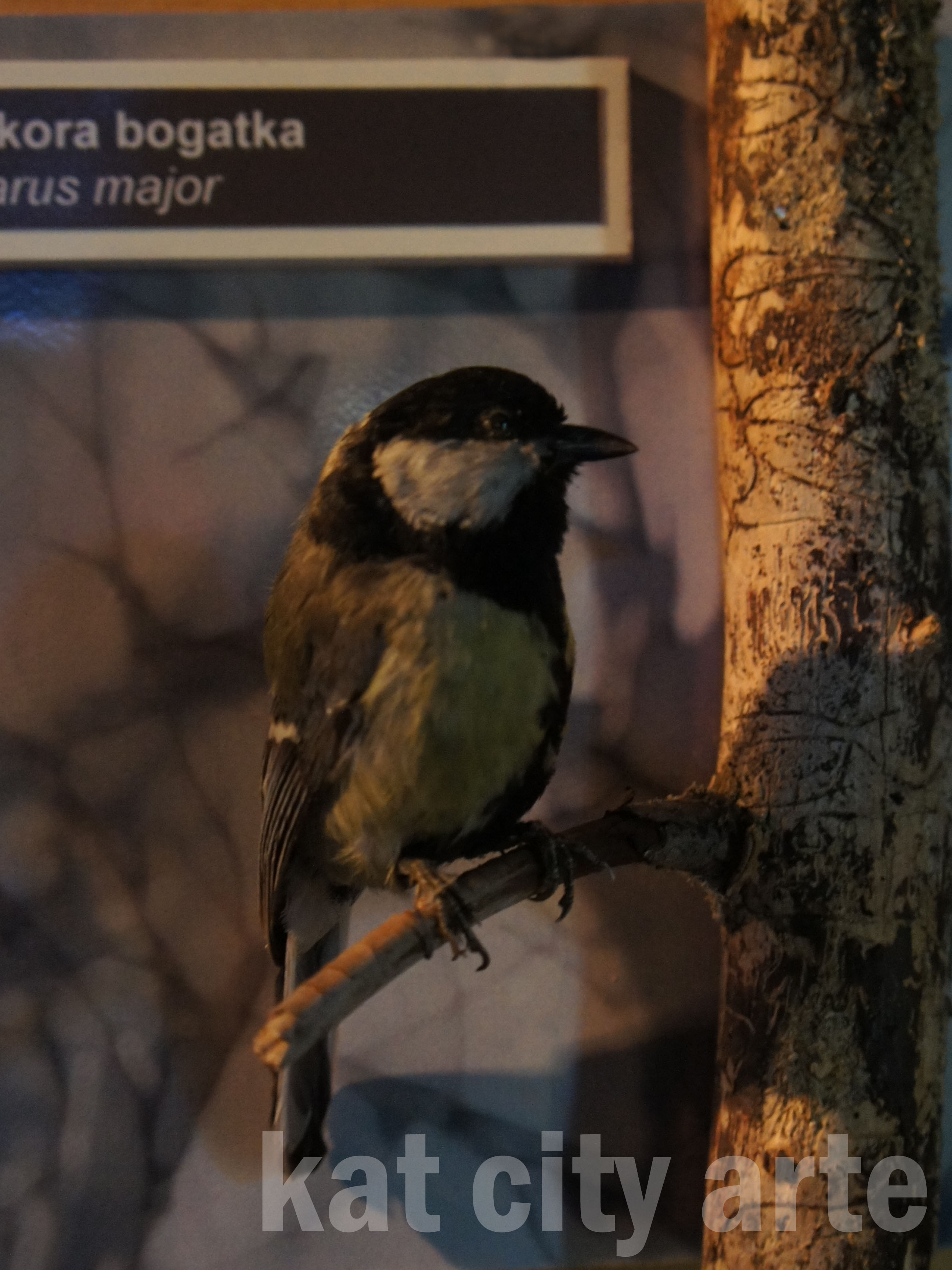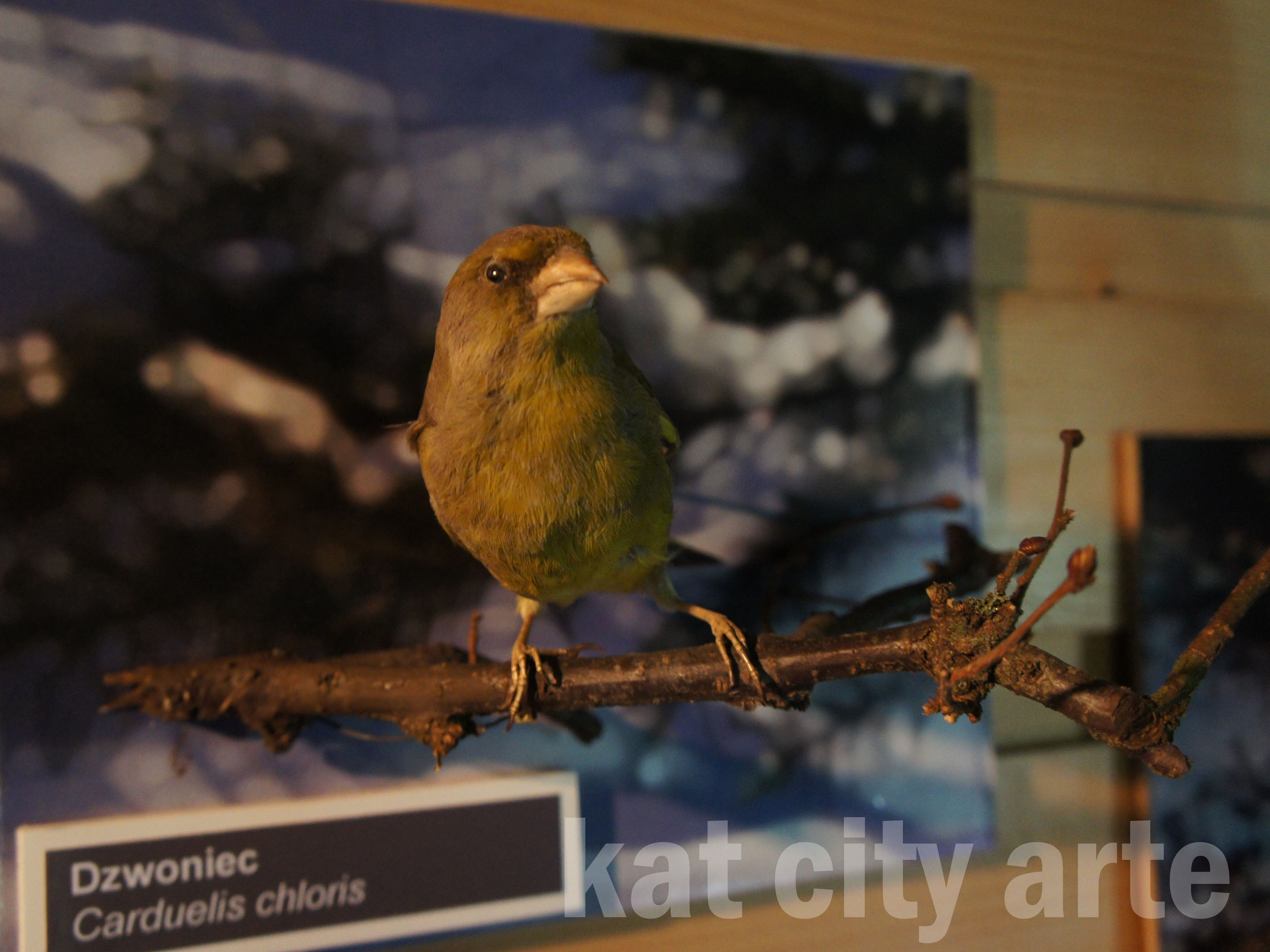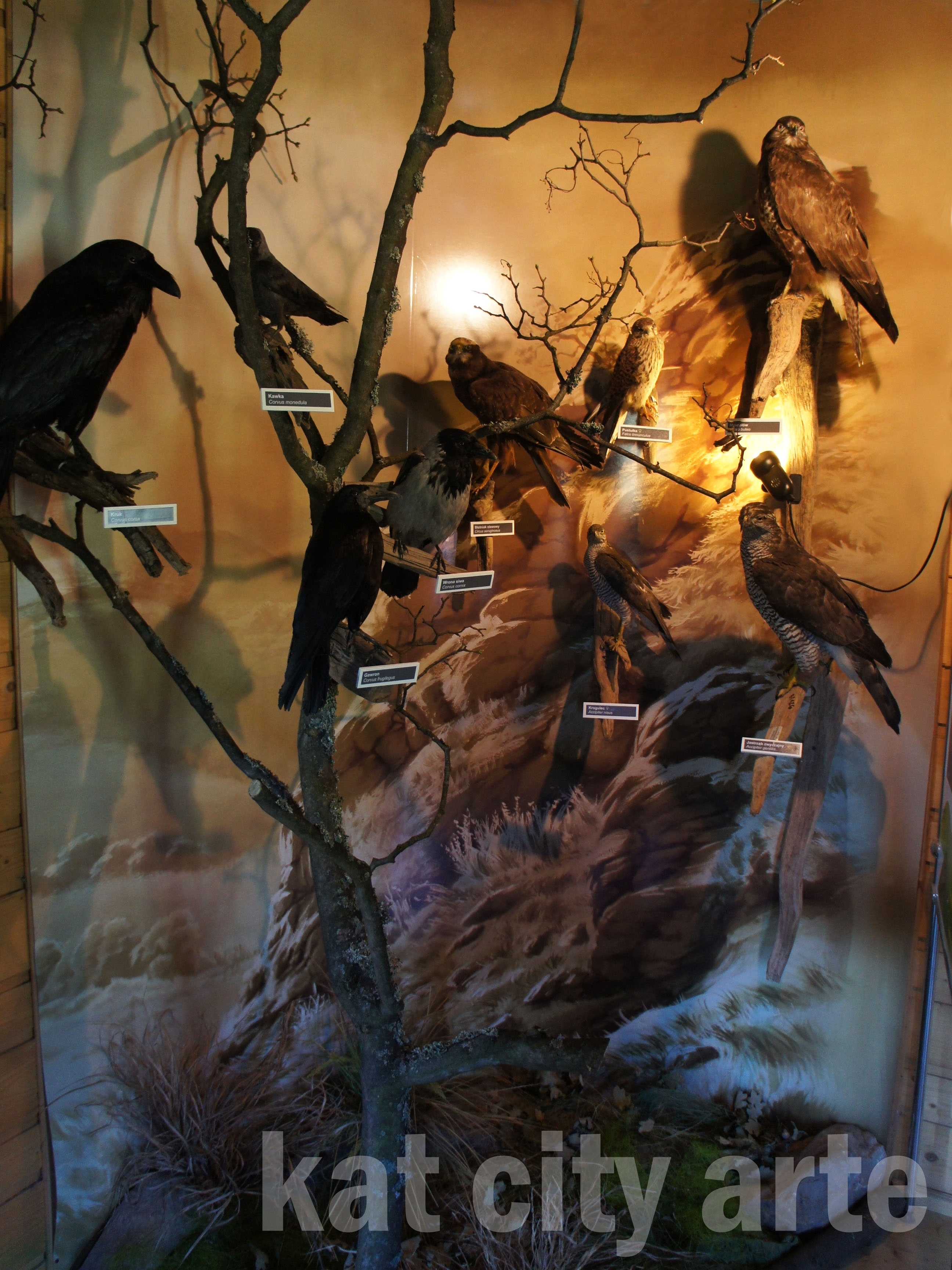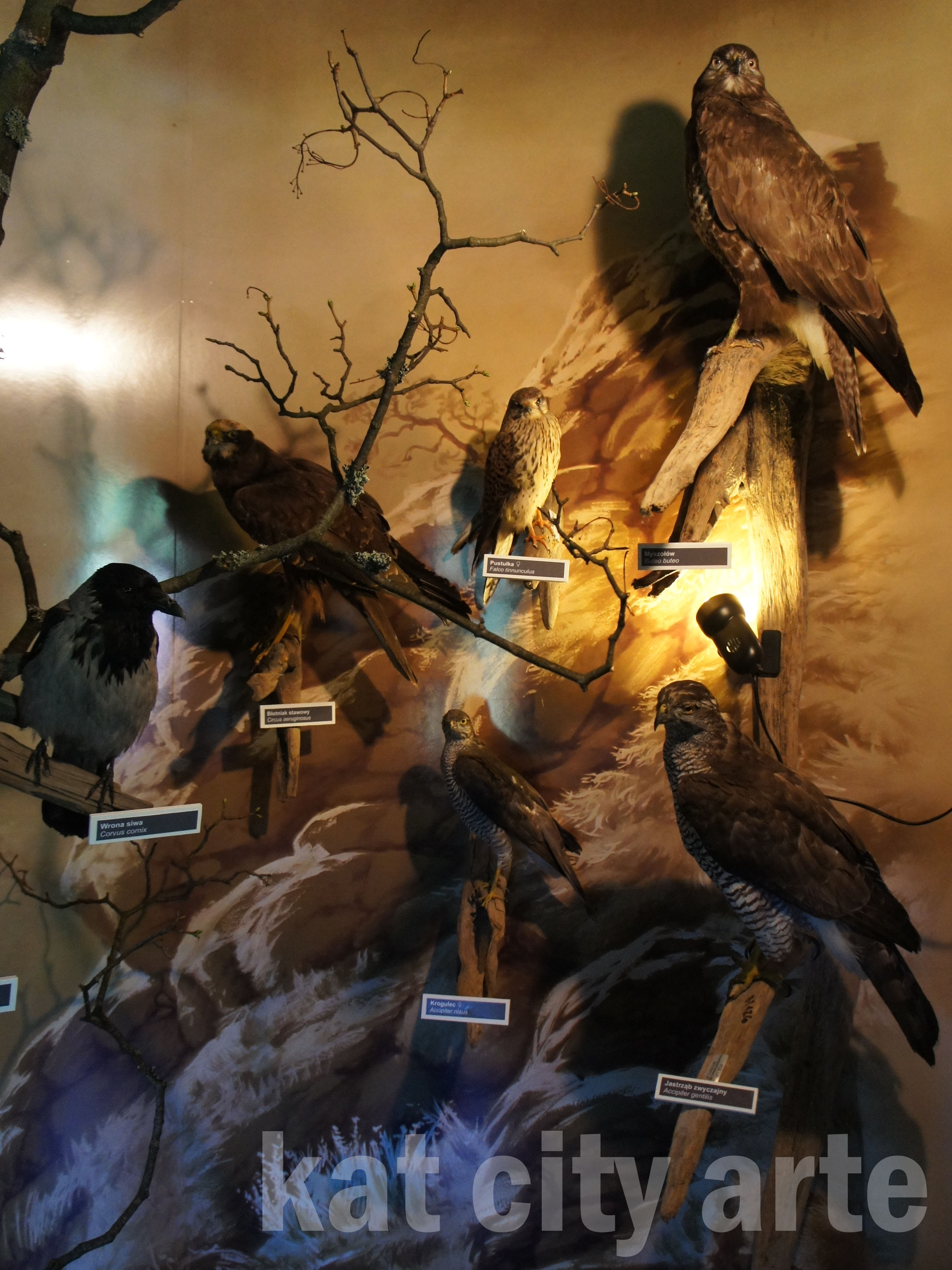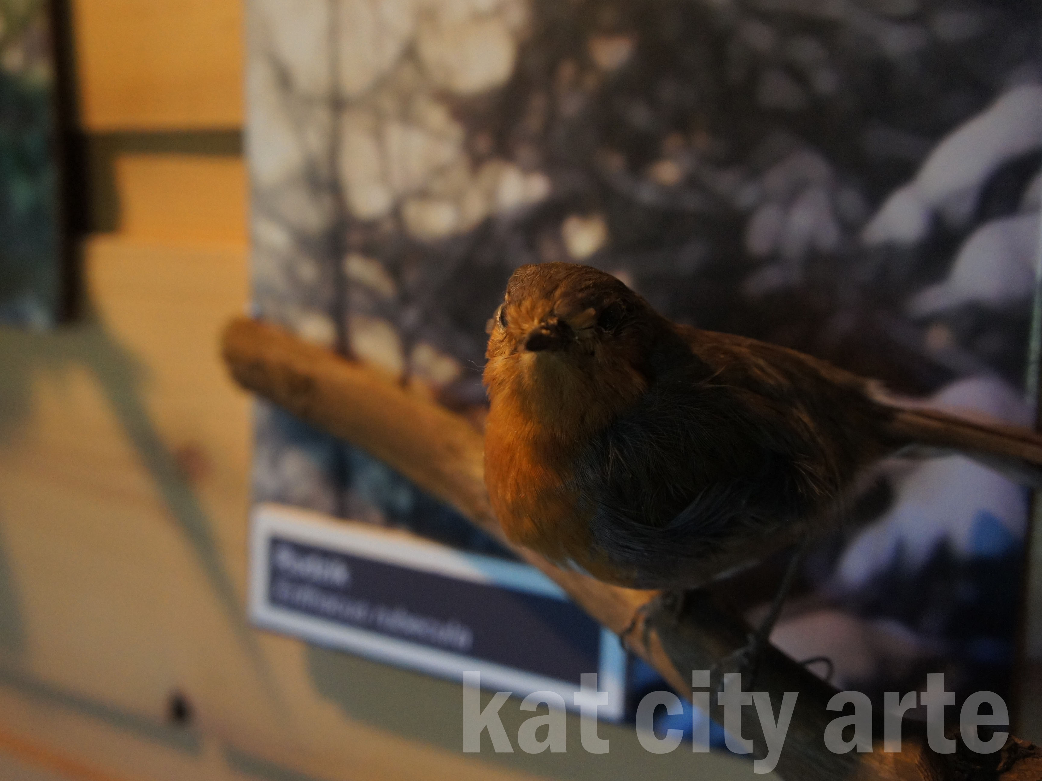 Na ścianie zawisły też rozmyte zdjęcia, a na ich tle mniejsze ptaki z tabliczkami opisowymi.