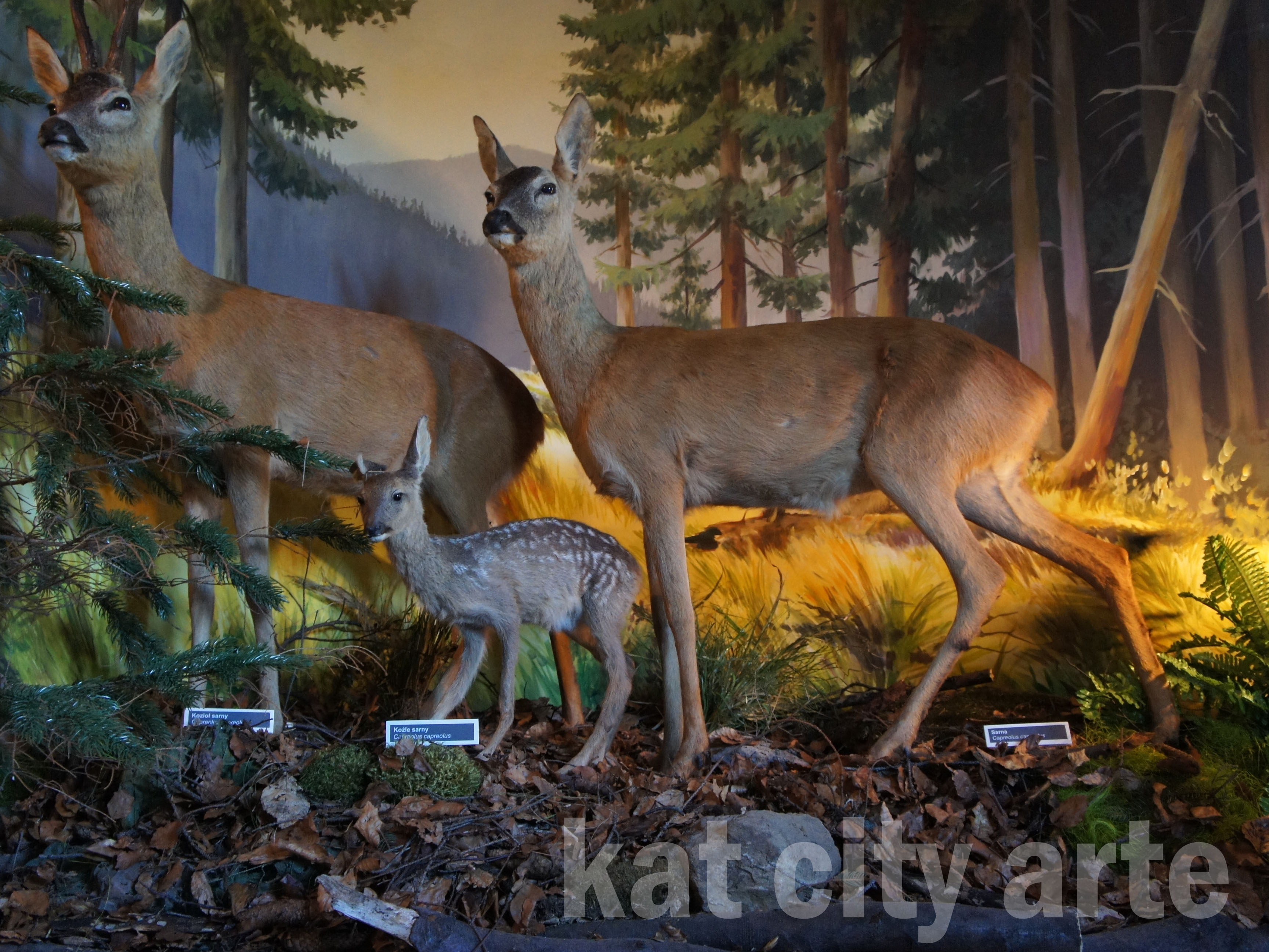 W narożnikach sali umieszczone zostały dwie dioramki z sarnami i ptakami drapieżnymi.