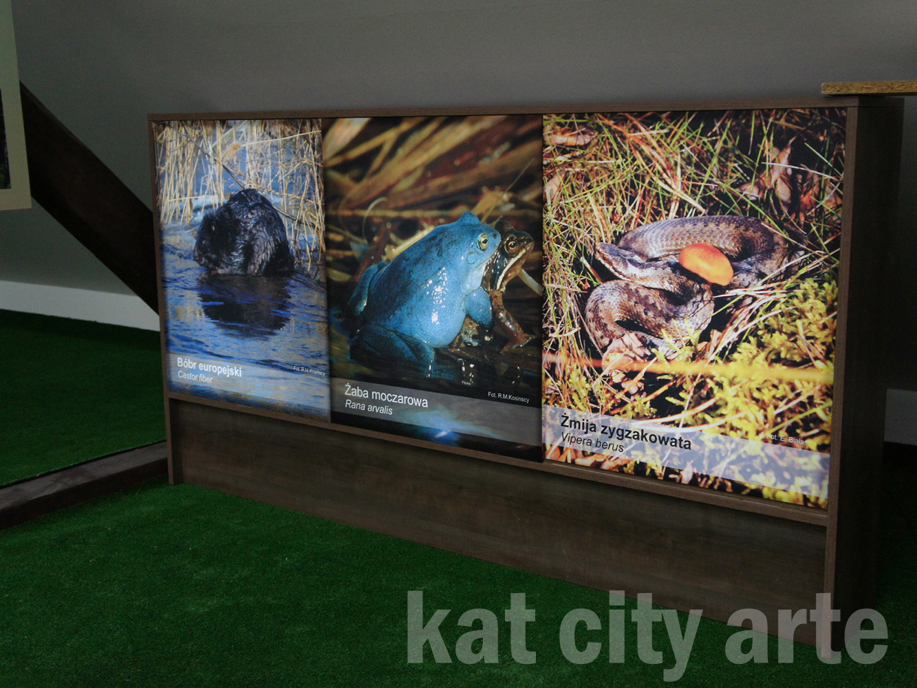 - Podświetlane kasetony z fotografiami chronionej fauny i flory