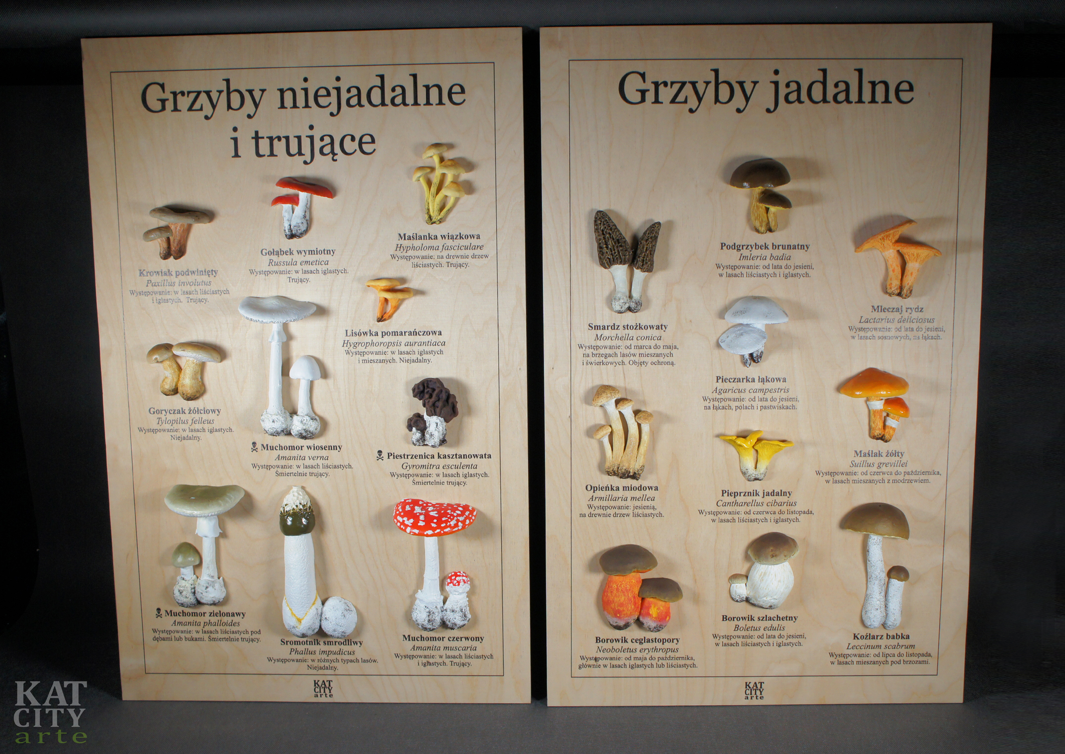W swojej ofercie posiadamy także edukacyjne/dydaktyczne tablice. Tablice z modelami grzybów: jadalnymi i trującymi wykonane są na sklejce wodoodpornej. Wielkość tablicy to 51x80cm, na zamówienie możemy jednak wykonać tablice o innych wymiarach.